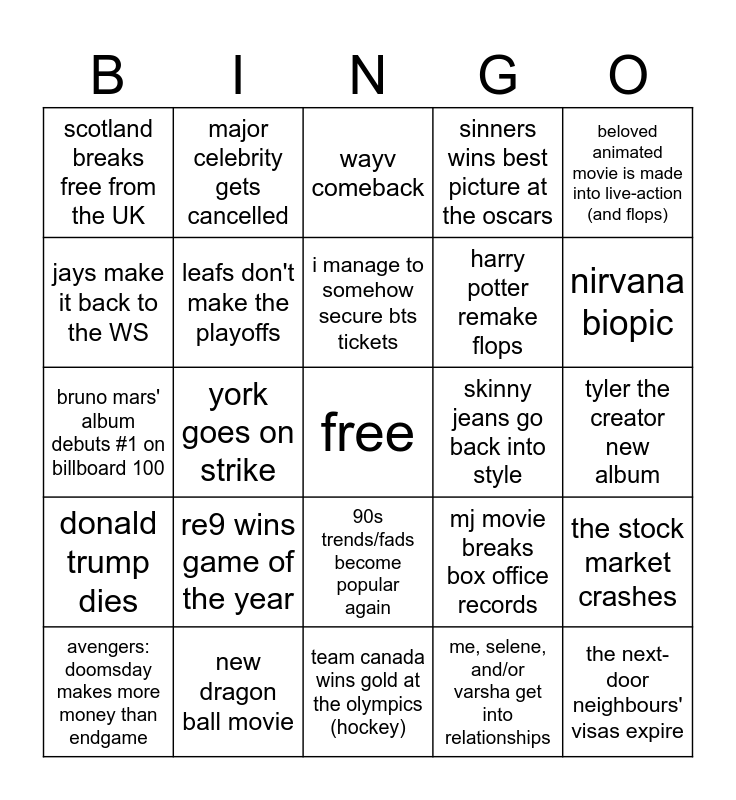 This bingo card has a free space and 24 words: re9 wins game of the year, new dragon ball movie, i manage to somehow secure bts tickets, avengers: doomsday makes more money than endgame, beloved animated movie is made into live-action (and flops), scotland breaks free from the UK, jays make it back to the WS, major celebrity gets cancelled, skinny jeans go back into style, 90s trends/fads become popular again, harry potter remake flops, bruno mars' album debuts #1 on billboard 100, mj movie breaks box office records, the stock market crashes, leafs don't make the playoffs, me, selene, and/or varsha get into relationships, tyler the creator new album, wayv comeback, nirvana biopic, york goes on strike, the next-door neighbours' visas expire, donald trump dies, sinners wins best picture at the oscars and team canada wins gold at the olympics (hockey).