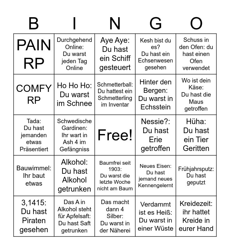 This bingo card has a free space and 24 words: Alkohol: Du hast Alkohol getrunken, Das A in Alkohol steht für Apfelsaft: Du hast Saft getrunken, Schmetterball: Du hattest ein Schmetterling im Inventar, 3,1415: Du hast Piraten gesehen, Schuss in den Ofen: du hast einen Ofen verwendet, PAIN RP, COMFY RP, Durchgehend Online: Du warst jeden Tag Online, Nessie?: Du hast Erie getroffen, Baumfrei seit 1903: Du warst die letzte Woche nicht am Baum, Hinter den Bergen: Du warst in Echsstein, Tada: Du hast jemanden etwas Präsentiert, Neues Eisen: Du hast jemand neues Kennengelernt, Frühjahrsputz: Du hast geputzt, Ho Ho Ho: Du warst im Schnee, Verdammt ist es Heiß: Du warst in einer Wüste, Hüha: Du hast ein Tier Geritten, Aye Aye: Du hast ein Schiff gesteuert, Wo ist dein Käse: Du hast die Maus getroffen, Schwedische Gardinen: Ihr wart in Ash 4 im Gefängniss, Kreidezeit: ihr hattet Kreide in eurer Hand, Bauwimmel: Ihr baut etwas, Kesh bist du es? Du hast ein Echsenwesen gesehen and Das macht dann 4 Silber: Du warst in der Näherei.