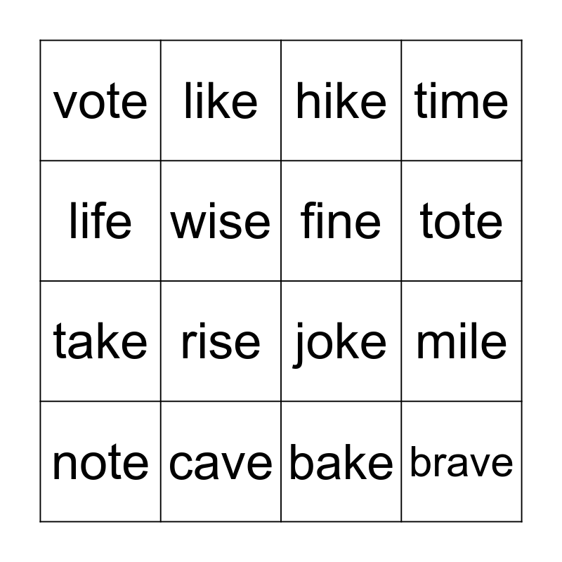 This bingo card has 16 words: cave, mile, hike, vote, take, like, joke, bake, life, wise, note, time, rise, tote, fine and brave.
