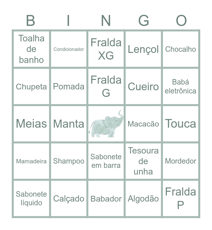 This bingo card has a free space and 35 words: Aspirador nasal, Termômetro, Body, Pomada, Sabonete em barra, Lençol, Chupeta, Canguru, Fralda G, Fralda M, Meias, Chocalho, Pano de boca, Escova de cabelo, Toalha de banho, Macacão, Algodão, Manta, Mamadeira, Fralda P, Tesoura de unha, Sabonete líquido, Mordedor, Calçado, Fralda XG, Babá eletrônica, Andador, Cotonete, Cueiro, Touca, Lenço umidecido, Babador, Shampoo, Condicionador and Almofada de amamentação.