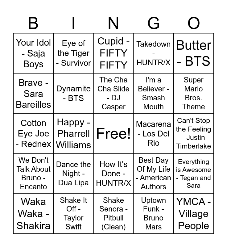 This bingo card has a free space and 40 words: Golden - HUNTR/X (K-Pop Demon Hunters), Cotton Eye Joe - Rednex, Soda Pop - Saja Boys (K-Pop Demon Hunters), Dynamite - BTS, Shake It Off - Taylor Swift, How It's Done - HUNTR/X, The Cha Cha Slide - DJ Casper, Baby Shark - Pinkfong, Butter - BTS, We Don't Talk About Bruno - Encanto, Happy - Pharrell Williams, Takedown - HUNTR/X, YMCA - Village People, Can't Stop the Feeling - Justin Timberlake, Macarena - Los Del Rio, Dance the Night - Dua Lipa, Life is a Highway - Rascal Flatts, Your Idol - Saja Boys, Firework - Katy Perry, Cupid - FIFTY FIFTY, Everything is Awesome - Tegan and Sara, Uptown Funk - Bruno Mars, I'm a Believer - Smash Mouth, Brave - Sara Bareilles, Under the Sea - The Little Mermaid, Roar - Katy Perry, Better When I'm Dancin' - Meghan Trainor, All Star - Smash Mouth, Flowers - Miley Cyrus (Clean), The Gummy Bear Song - Gummibär, What It Sounds Like - HUNTR/X, Waka Waka - Shakira, Try Everything - Shakira (Zootopia), Best Day Of My Life - American Authors, Super Mario Bros. Theme, Shake Senora - Pitbull (Clean), Kung Fu Fighting - CeeLo Green, I Like To Move It - Madagascar, Eye of the Tiger - Survivor and We Will Rock You - Queen.