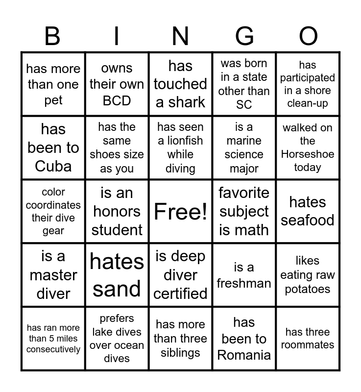 This bingo card has a free space and 39 words: favorite color is blue, has done research with the University, lives in Green Quad, has the same shoes size as you, has ran more than 5 miles consecutively, is deep diver certified, has seen a lionfish while diving, sunburns easily, has participated in a shore clean-up, is a master diver, is an honors student, was born in a state other than SC, has three roommates, hates seafood, favorite subject is math, hates sand, wants diving to be part of their career, has more than one pet, has been in the Tcoop fountain, is a freshman, has been to Cuba, has more than three siblings, is a marine science major, walked on the Horseshoe today, reads more than 40 books a year, has a birthday between Feb. 8th and Apr. 2nd, has swam in two or more oceans, has played an instrument for more than 5 years, has broken a bone, owns their own BCD, has seen/read My Octopus Teacher, has a phone thats not an iPhone, has touched a shark, prefers lake dives over ocean dives, has been to Romania, has more than 100 dives, likes eating raw potatoes, color coordinates their dive gear and studies lizards.