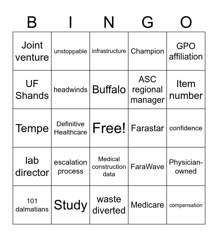 This bingo card has a free space and 70 words: EDSM, confidence, clinical, results, Study, OHSU, Champion, talk track, GPO affiliation, ablation, Physician-owned, Management company, Joint venture, infrastructure, Administration load, Definitive Healthcare, Medical construction data, ASC regional manager, Premier Surpass, lab director, Farastar, FaraWave, Item number, reimbursement, ROI, cost per case, coding, coverage, Medicare, Save Simply, unstoppable, SAMP, collections, gift, connectivity, partner, focus, Philips warranty, disposable ECG lead, UF Shands, telemetry manager, escalation process, compensation, tailwinds, Market leadership, headwinds, 101 dalmatians, Strat Sale, New messaging, Full-service support, Supply Chain resilience, Savings delivered, Products for the planet, veritree, waste diverted, Environmental Excellence Award, Buffalo, Upstream, Downstream, Movie night, Tempe, Lakeland, Tijuana, Chandler, Site visit, Customer engagement, Mainstage, Approval, Business Review and SSS Story.