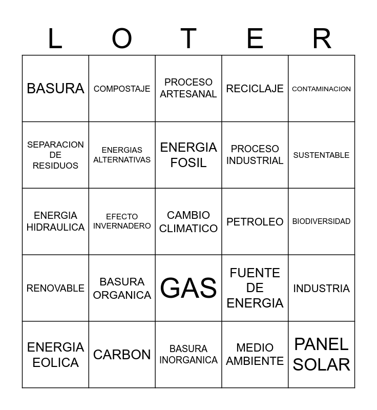 This bingo card has 30 words: ENERGIA EOLICA, ENERGIA SOLAR, ENERGIA FOSIL, ENERGIA ELECTRICA, CONTAMINACION, BASURA, COMPOSTAJE, GAS, PETROLEO, PANEL SOLAR, RENOVABLE, ENERGIAS ALTERNATIVAS, DAÑO AMBIENTAL, MEDIO AMBIENTE, INDUSTRIA, PROCESO TECNICO, EFECTO INVERNADERO, CAMBIO CLIMATICO, FUENTE DE ENERGIA, SUSTENTABLE, ENERGIA HIDRAULICA, CARBON, PROCESO ARTESANAL, PROCESO INDUSTRIAL, BIODIVERSIDAD, SEPARACION DE RESIDUOS, BASURA ORGANICA, BASURA INORGANICA, RECICLAJE and CALENTADOR SOLAR.