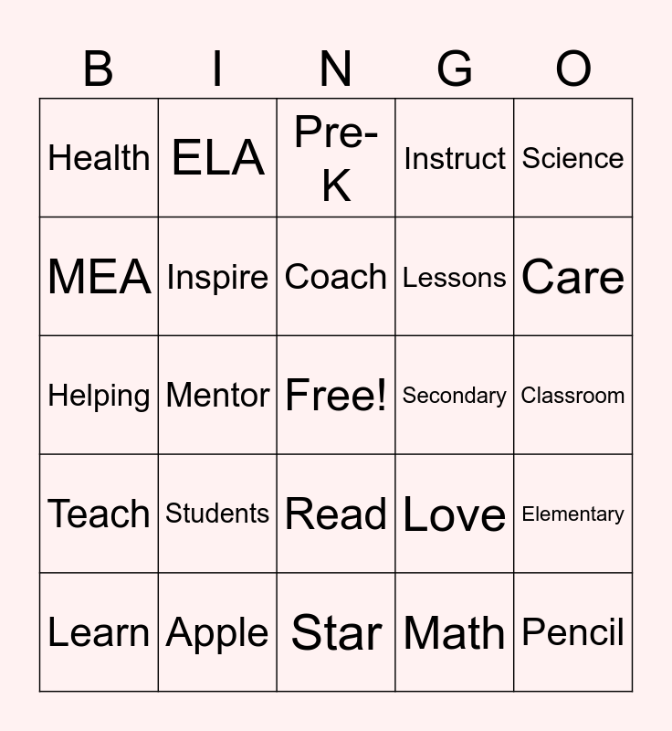 This bingo card has a free space and 25 words: Teach, Apple, Star, Math, Science, Health, ELA, Pre-K, Secondary, Elementary, MEA, Inspire, Educate, Love, Care, Learn, Mentor, Coach, Lessons, Classroom, Helping, Students, Read, Instruct and Pencil.