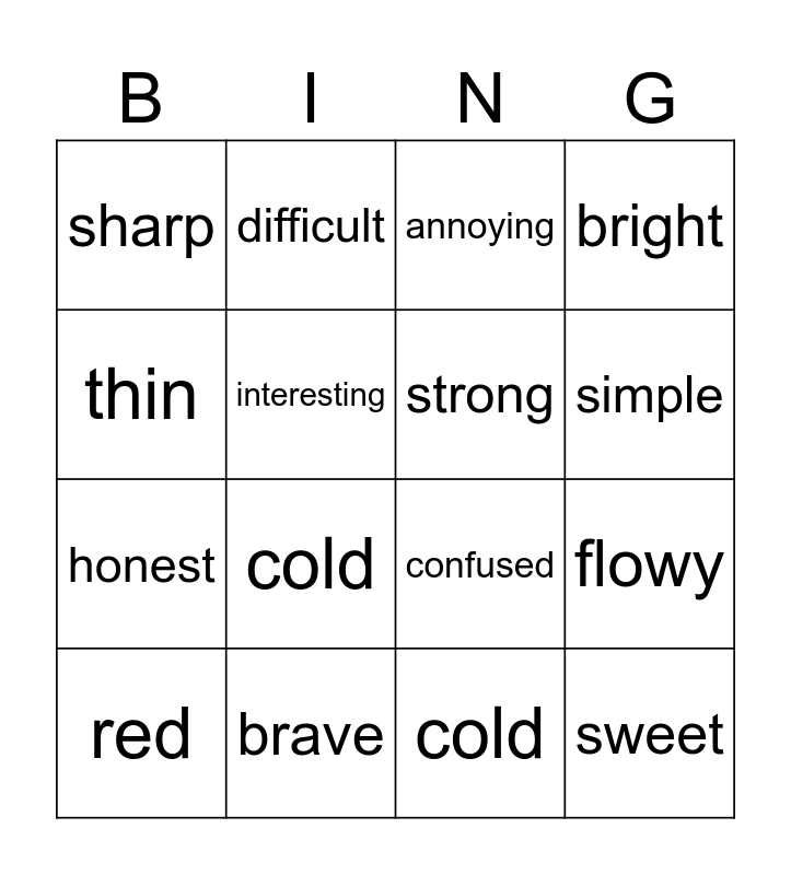This bingo card has 28 words: FREE, dark, cold, green, thin, difficult, annoying, flowy, honest, brave, curious, bright, amazing, bitter, responsible, creative, delicious, interesting, confused, sweet, sharp, neat, quiet, simple, red, cold, strong and colorful.
