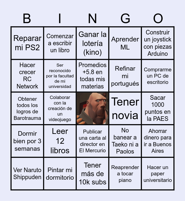 This bingo card has a free space and 24 words: Leer 12 libros, Pintar mi dormitorio, Promedios +5.8 en todas mis materias, Ver Naruto Shippuden, Construir un joystick con piezas Arduino, Reparar mi PS2, Hacer crecer RC Network, Comenzar a escribir un libro, Tener novia, Publicar una carta al director en El Mercurio, Refinar mi portugués, Obtener todos los logros de Barotrauma, No banear a Taeko ni a Paolos, Ahorrar dinero para ir a Buenos Aires, Ser reconocido por la facultad de mi universidad, Reaprender a tocar piano, Sacar 1000 puntos en la PAES, Ganar la lotería (kino), Comprarme un PC de escritorio, Colaborar con la creación de un videojuego, Hacer un paper universitario, Dormir bien por 3 semanas, Aprender ML and Tener más de 10k subs.