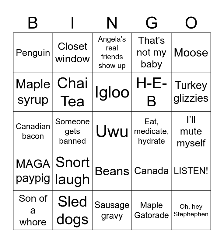 This bingo card has a free space and 26 words: Beans, Maple Gatorade, Igloo, Sled dogs, Moose, Penguin, Maple syrup, Closet window, I’ll mute myself, Canada, H-E-B, Canadian bacon, LISTEN!, Son of a whore, Someone gets banned, Someone doesn’t get banned, That’s not my baby, MAGA paypig, Angela’s real friends show up, Oh, hey Stephephen, Turkey glizzies, Sausage gravy, Eat, medicate, hydrate, Snort laugh, Chai Tea and Nöel says GET!.