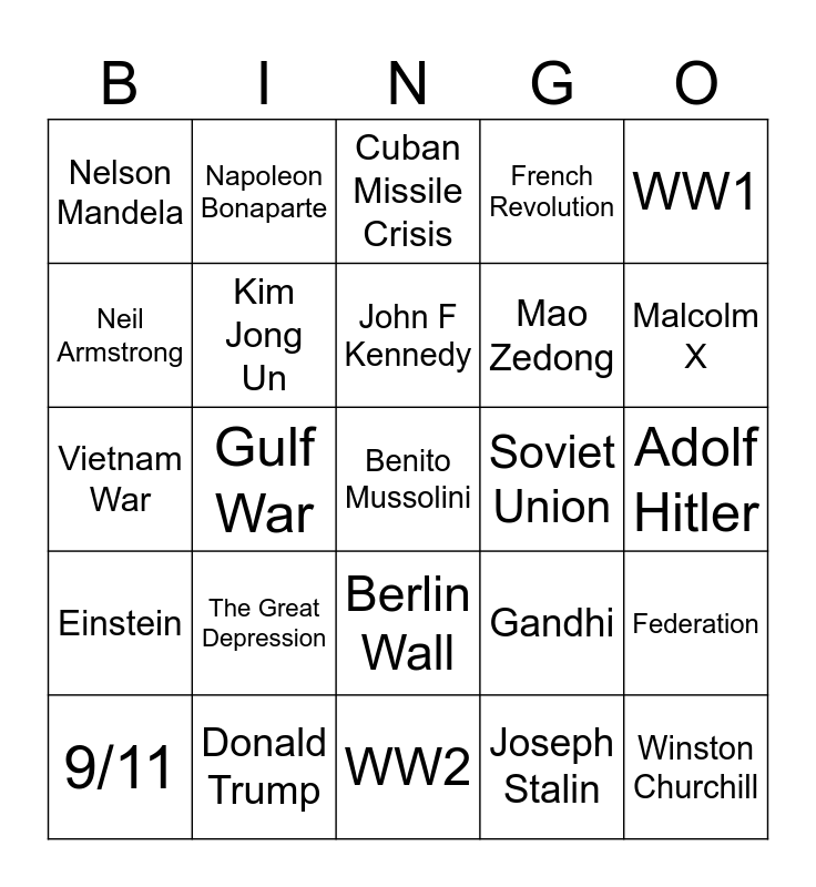 This bingo card has 30 words: Donald Trump, Vladimir Putin, Gulf War, Apartheid, Nelson Mandela, Cuban Missile Crisis, Kim Jong Un, Berlin Wall, Soviet Union, WW2, Adolf Hitler, Benito Mussolini, Joseph Stalin, Winston Churchill, Malcolm X, Industrial Revolution, Gandhi, Einstein, The Great Depression, WW1, Vietnam War, Korean War, Napoleon Bonaparte, Mao Zedong, Neil Armstrong, French Revolution, Federation, 9/11, John F Kennedy and Mikhail Gorbachev.