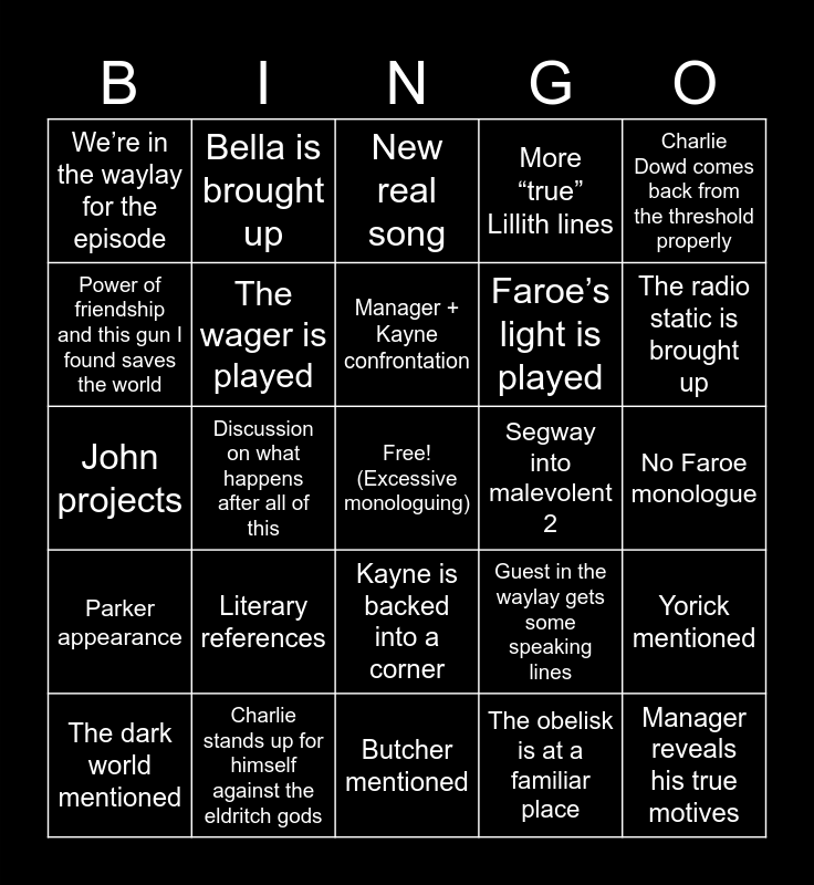 This bingo card has a free space and 24 words: The dark world mentioned, Literary references, Manager + Kayne confrontation, The obelisk is at a familiar place, Charlie Dowd comes back from the threshold properly, We’re in the waylay for the episode, Bella is brought up, New real song, Segway into malevolent 2, No Faroe monologue, John projects, The wager is played, Guest in the waylay gets some speaking lines, Yorick mentioned, Power of friendship and this gun I found saves the world, Charlie stands up for himself against the eldritch gods, Butcher mentioned, More “true” Lillith lines, The radio static is brought up, Parker appearance, Discussion on what happens after all of this, Kayne is backed into a corner, Faroe’s light is played and Manager reveals his true motives.