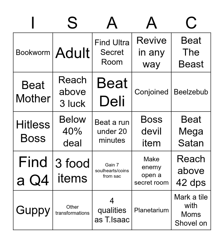 This bingo card has 25 words: 3 food items, 4 qualities as T.Isaac, Beat Deli, Guppy, Beat The Beast, Bookworm, Beat Mother, Adult, Boss devil item, Gain 7 soulhearts/coins from sac, Conjoined, Hitless Boss, Make enemy open a secret room, Reach above 42 dps, Reach above 3 luck, Mark a tile with Moms Shovel on, Beat Mega Satan, Find Ultra Secret Room, Beelzebub, Below 40% deal, Beat a run under 20 minutes, Other transformations, Find a Q4, Revive in any way and Planetarium.