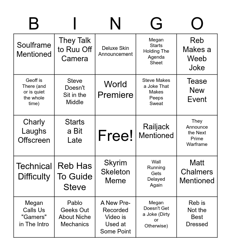 This bingo card has a free space and 24 words: Reb Has To Guide Steve, Pablo Geeks Out About Niche Mechanics, World Premiere, Megan Calls Us "Gamers" in The Intro, Reb Makes a Weeb Joke, Soulframe Mentioned, Geoff is There (and or is quiet the whole time), They Talk to Ruu Off Camera, Railjack Mentioned, Skyrim Skeleton Meme, Steve Makes a Joke That Makes Peeps Sweat, Charly Laughs Offscreen, Wall Running Gets Delayed Again, Matt Chalmers Mentioned, Steve Doesn't Sit in the Middle, Megan Doesn't Get a Joke (Dirty or Otherwise), They Announce the Next Prime Warframe, Deluxe Skin Announcement, Tease New Event, Starts a Bit Late, Reb is Not the Best Dressed, Technical Difficulty, Megan Starts Holding The Agenda Sheet and A New Pre-Recorded Video is Used at Some Point.