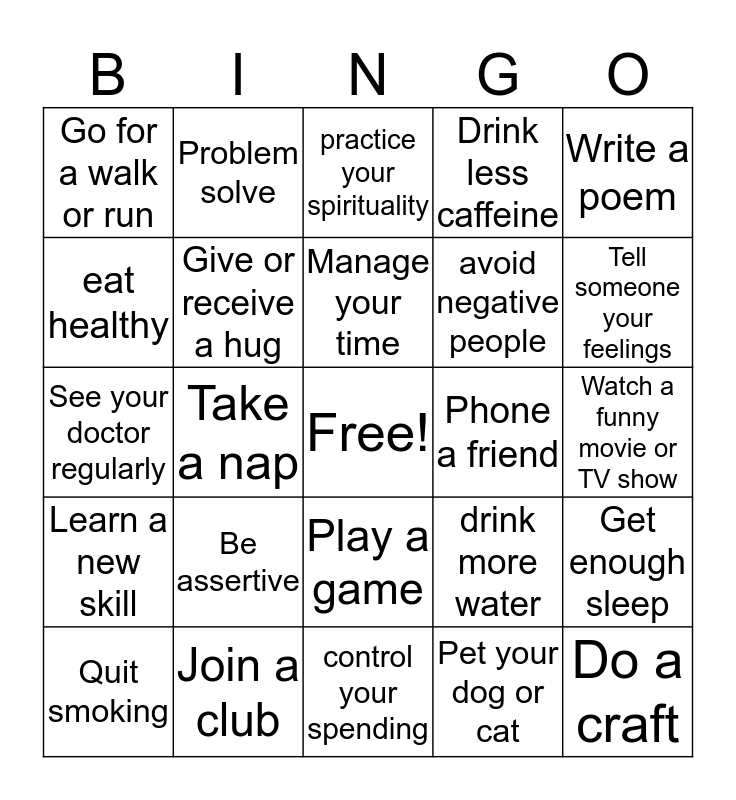 This bingo card has a free space and 27 words: drink more water, exercise, avoid negative people, control your spending, eat healthy, practice your spirituality, Problem solve, Learn a new skill, Phone a friend, Get enough sleep, See your doctor regularly, Drink less caffeine, Quit smoking, Join a club, Tell someone your feelings, Meditate, Give or receive a hug, Manage your time, Be assertive, Go for a walk or run, Watch a funny movie or TV show, Pet your dog or cat, Take a nap, Do a craft, Play a game, Write a poem and Yoga.