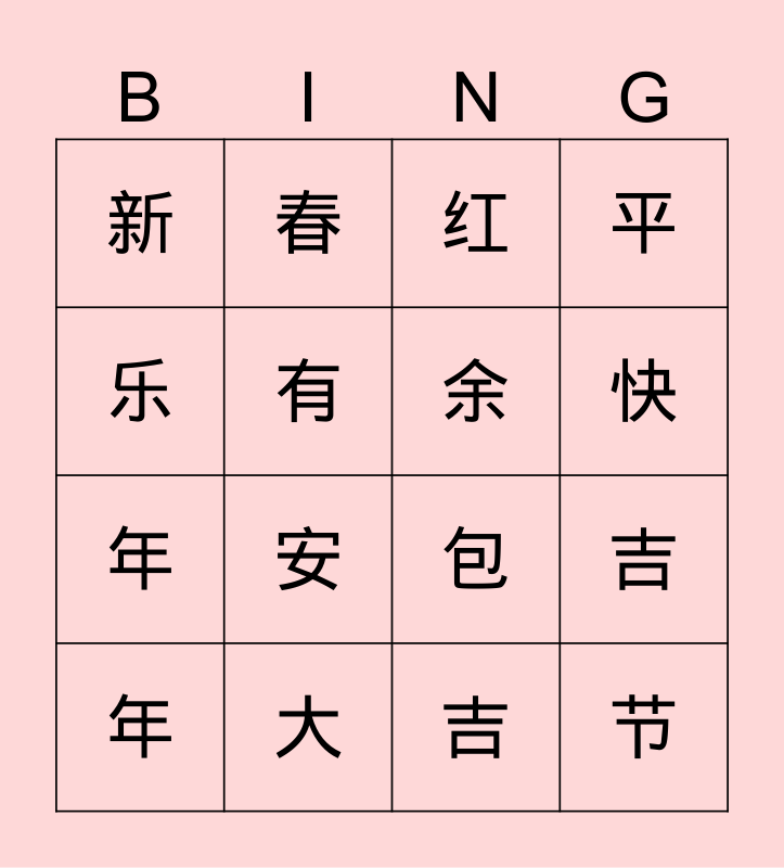 This bingo card has 16 words: 大, 吉, 红, 新, 年, 春, 包, 吉, 乐, 有, 年, 平, 安, 快, 余 and 节.