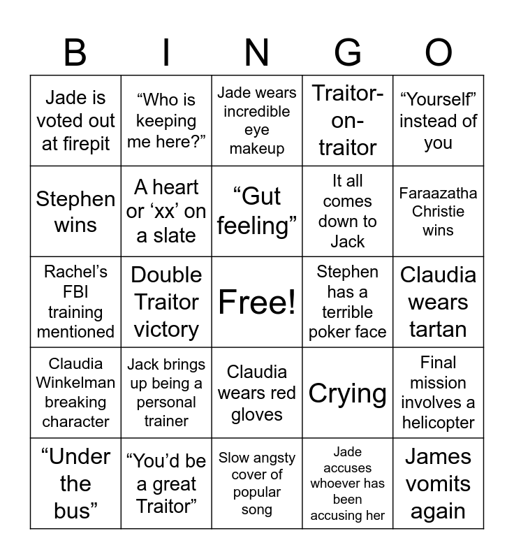 This bingo card has a free space and 36 words: Peacock sound, Someone cries, Someone changes their mind, rubs out a name and writes another one, A heart or ‘xx’ on a slate, Crying, Claudia Winkelman breaking character, “Gut feeling”, “Playing/played a blinder”, “Yourself” instead of you, “The library five”, Double Traitor victory, Traitor-on-traitor, James interrupts someone, Stephen has a terrible poker face, Faraazatha Christie wins, Jade is voted out at firepit, Rachel and Stephen have a whispered conversation, Jack brings up being a personal trainer, James vomits again, Jade wears incredible eye makeup, Claudia wears tartan, Final mission involves a helicopter, “You’d be a great Traitor”, “Under the bus”, Slow angsty cover of popular song, “Who is keeping me here?”, Rachel’s FBI training mentioned, Stephen wears kilt, It all comes down to Jack, Stephen wins, Rachel wins, Faithful win, Jade accuses whoever has been accusing her, Claudia wears red gloves, Close up of smoked salmon at breakfast and Traitors realise they shouldn’t have murdered Roxy.