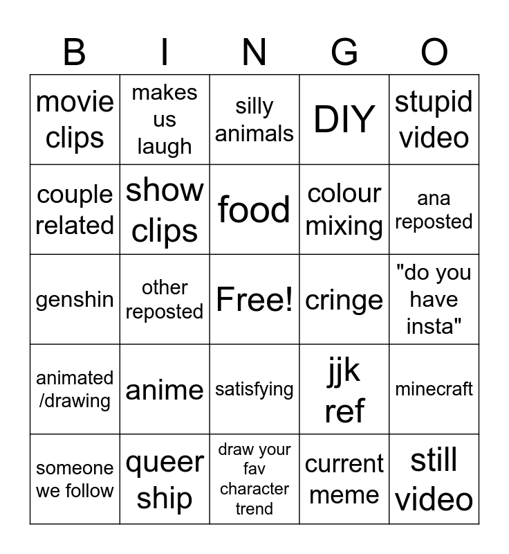 This bingo card has a free space and 24 words: anime, queer ship, food, someone we follow, stupid video, movie clips, couple related, makes us laugh, cringe, satisfying, colour mixing, genshin, jjk ref, minecraft, show clips, current meme, "do you have insta", silly animals, ana reposted, other reposted, still video, animated /drawing, DIY and draw your fav character trend.