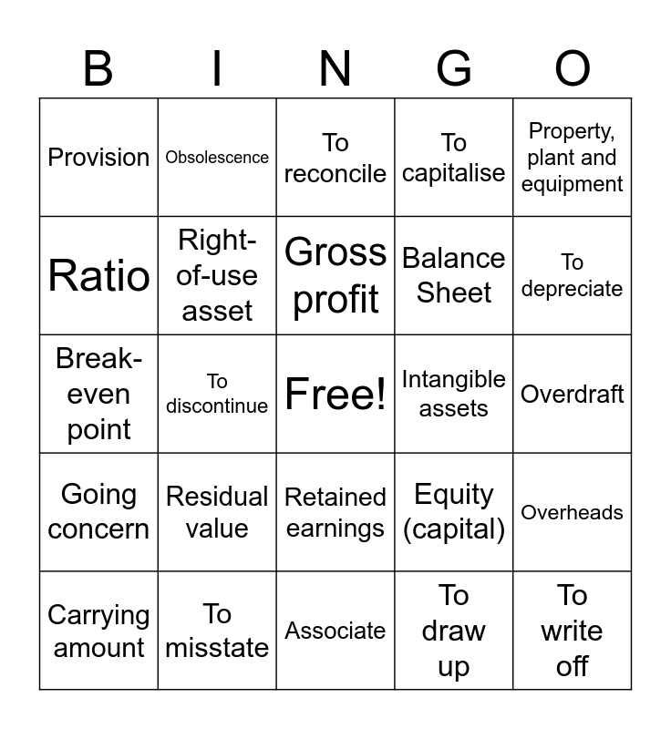 This bingo card has a free space and 25 words: Residual value, Associate, Gross profit, Carrying amount, Property, plant and equipment, Provision, Ratio, Obsolescence, Intangible assets, Retained earnings, Balance Sheet, Break-even point, Equity (capital), Overheads, Right-of-use asset, Accruals principle, Overdraft, To reconcile, To depreciate, To discontinue, To write off, To misstate, Going concern, To capitalise and To draw up.