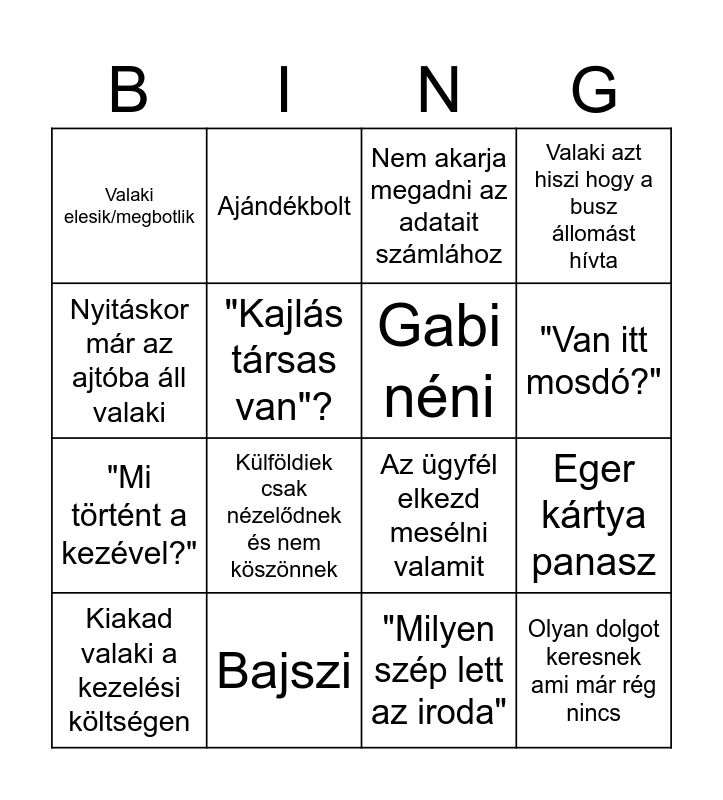 This bingo card has 16 words: Bajszi, Eger kártya panasz, Nem akarja megadni az adatait számlához, Valaki elesik/megbotlik, "Mi történt a kezével?", Ajándékbolt, Az ügyfél elkezd mesélni valamit, "Milyen szép lett az iroda", Nyitáskor már az ajtóba áll valaki, "Kajlás társas van"?, Kiakad valaki a kezelési költségen, Valaki azt hiszi hogy a busz állomást hívta, Külföldiek csak nézelődnek és nem köszönnek, "Van itt mosdó?", Gabi néni and Olyan dolgot keresnek ami már rég nincs.