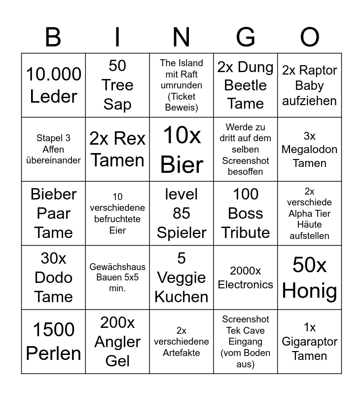 This bingo card has a free space and 24 words: Gewächshaus Bauen 5x5 min., 200x Angler Gel, 10x Bier, 1500 Perlen, 2x Raptor Baby aufziehen, 10.000 Leder, Stapel 3 Affen übereinander, 50 Tree Sap, 100 Boss Tribute, 5 Veggie Kuchen, Werde zu dritt auf dem selben Screenshot besoffen, Bieber Paar Tame, 2000x Electronics, 50x Honig, 2x Rex Tamen, Screenshot Tek Cave Eingang (vom Boden aus), 2x verschiede Alpha Tier Häute aufstellen, The Island mit Raft umrunden (Ticket Beweis), 3x Megalodon Tamen, 10 verschiedene befruchtete Eier, 1x Gigaraptor Tamen, 30x Dodo Tame, 2x Dung Beetle Tame and 2x verschiedene Artefakte.