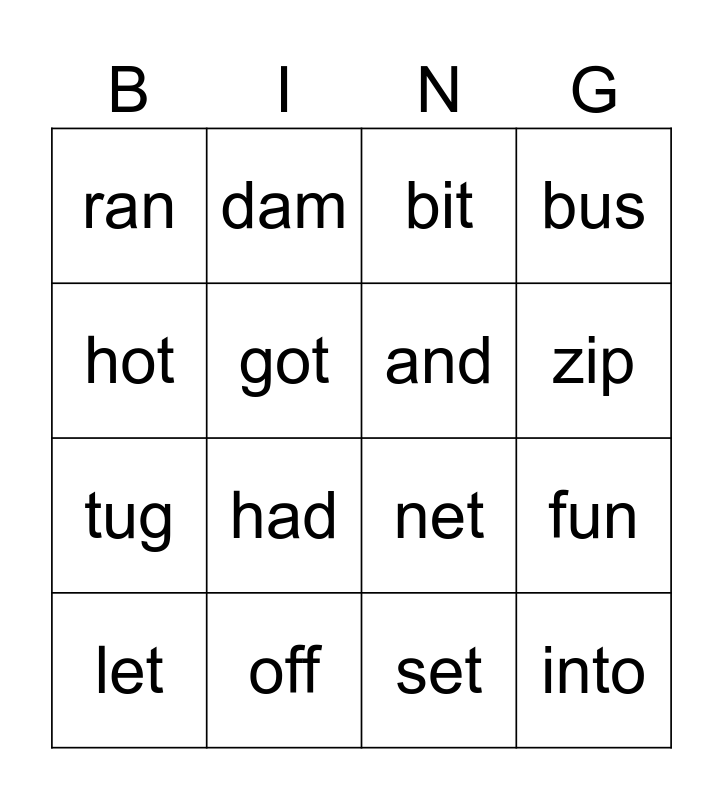 This bingo card has 16 words: off, fun, bit, ran, tug, dam, net, set, hot, got, let, bus, had, zip, and and into.