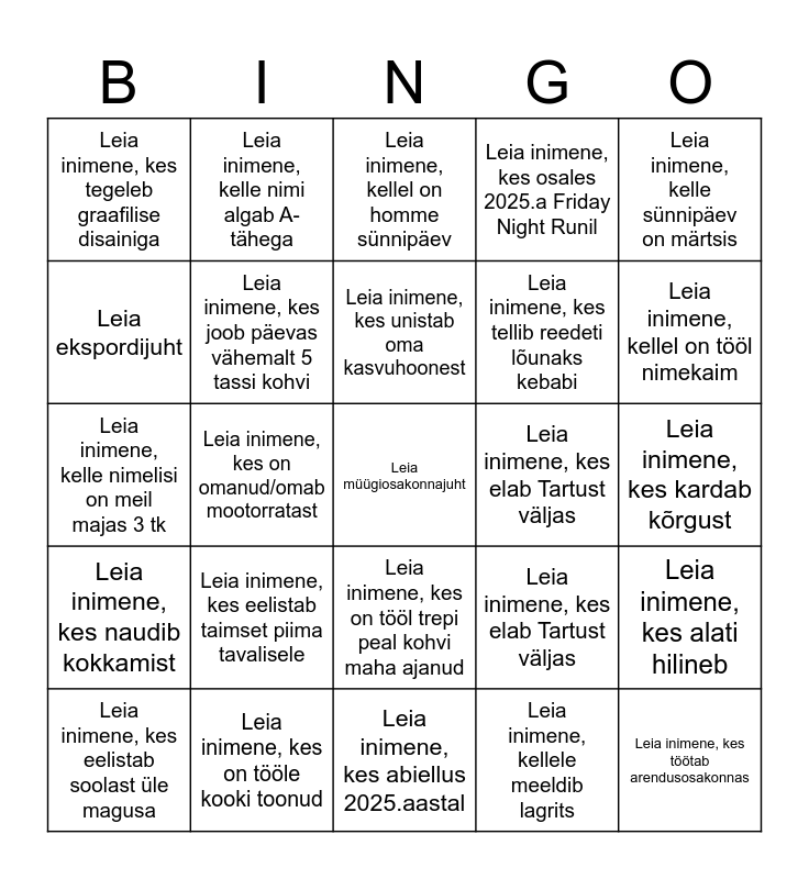 ⚠ This card has duplicate items: Leia inimene, kes on sündinud oktoobris (2), Leia inimene, kes elab Tartust väljas (2), Leia inimene, kes tähistab Halloweeni (2), Leia inimene, kellel on rohelised silmad (2)