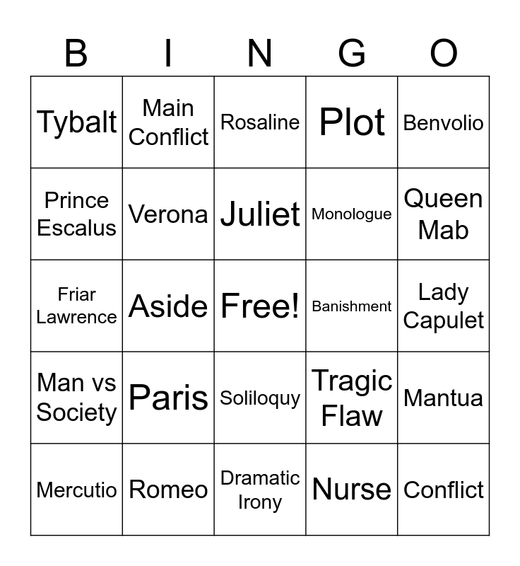 This bingo card has a free space and 24 words: Paris, Romeo, Juliet, Mercutio, Benvolio, Tybalt, Prince Escalus, Main Conflict, Banishment, Soliloquy, Monologue, Friar Lawrence, Tragic Flaw, Mantua, Verona, Nurse, Lady Capulet, Rosaline, Queen Mab, Aside, Conflict, Man vs Society, Plot and Dramatic Irony.