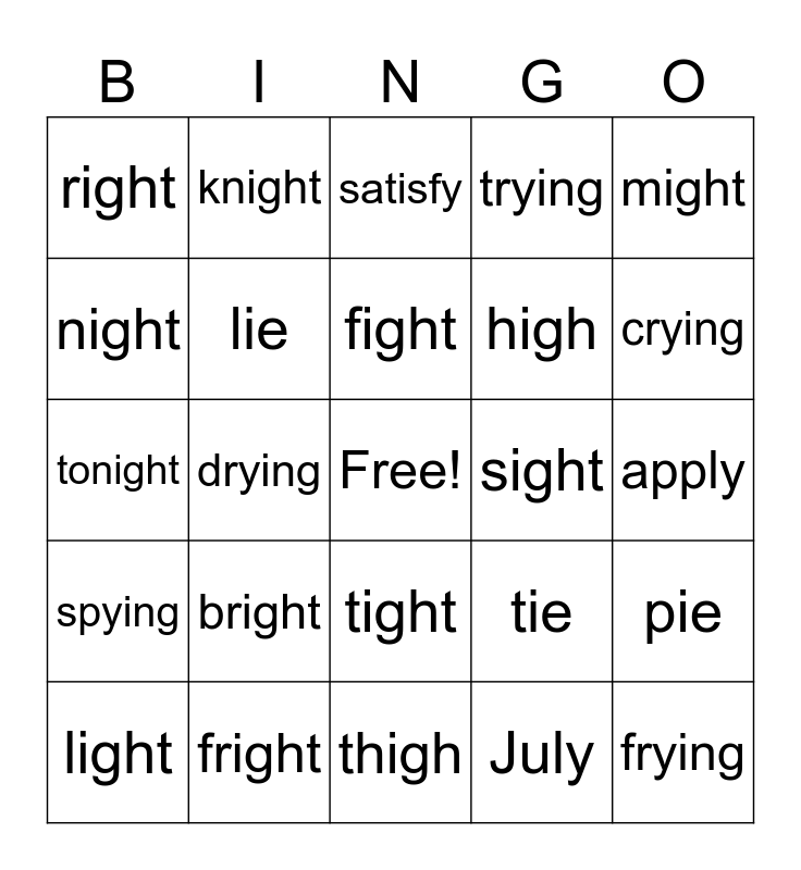 This bingo card has a free space and 24 words: bright, fright, fight, light, might, right, night, knight, sight, tight, high, tonight, tie, pie, lie, July, apply, satisfy, crying, drying, frying, spying, trying and thigh.