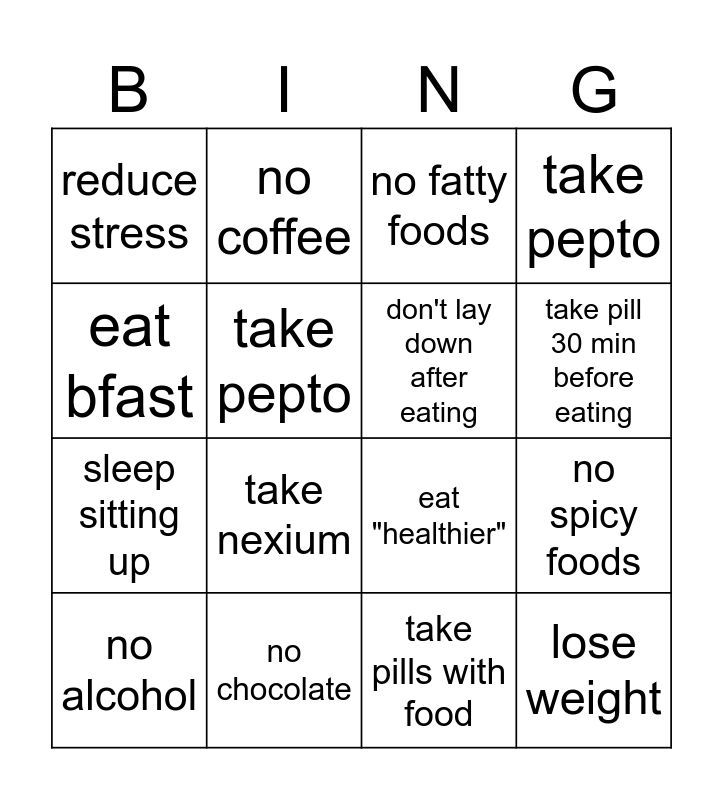 This bingo card has 23 words: lose weight, no soda, take pill 30 min before eating, no food right before bed, eat bfast, reduce stress, take pepto, no coffee, no alcohol, exercise, take nexium, sleep sitting up, mentions clean endoscopy, eat slower, no chocolate, take tums, no fatty foods, eat "healthier", don't lay down after eating, no spicy foods, take pepto, take pills with food and no alcohol.