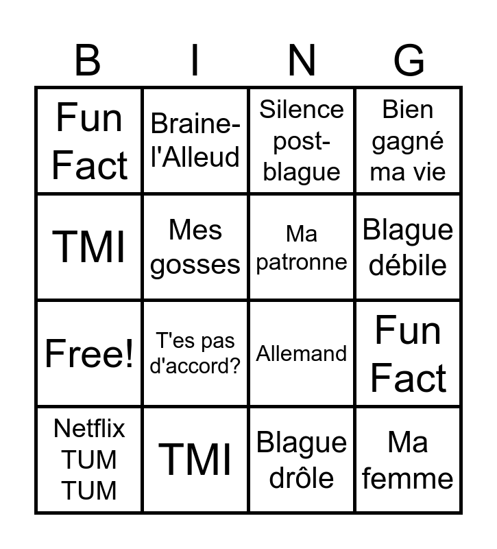 This bingo card has 20 words: Fun Fact, Et donc!, Silence post-blague, Quoi?, Netflix TUM TUM, TMI, TMI, Fun Fact, Free!, Braine- l'Alleud, T'es pas d'accord?, Allemand, Mes gosses, Ma femme, Ma patronne, Blague débile, Blague débile, Bien gagné ma vie, Blague drôle and Mercedes.