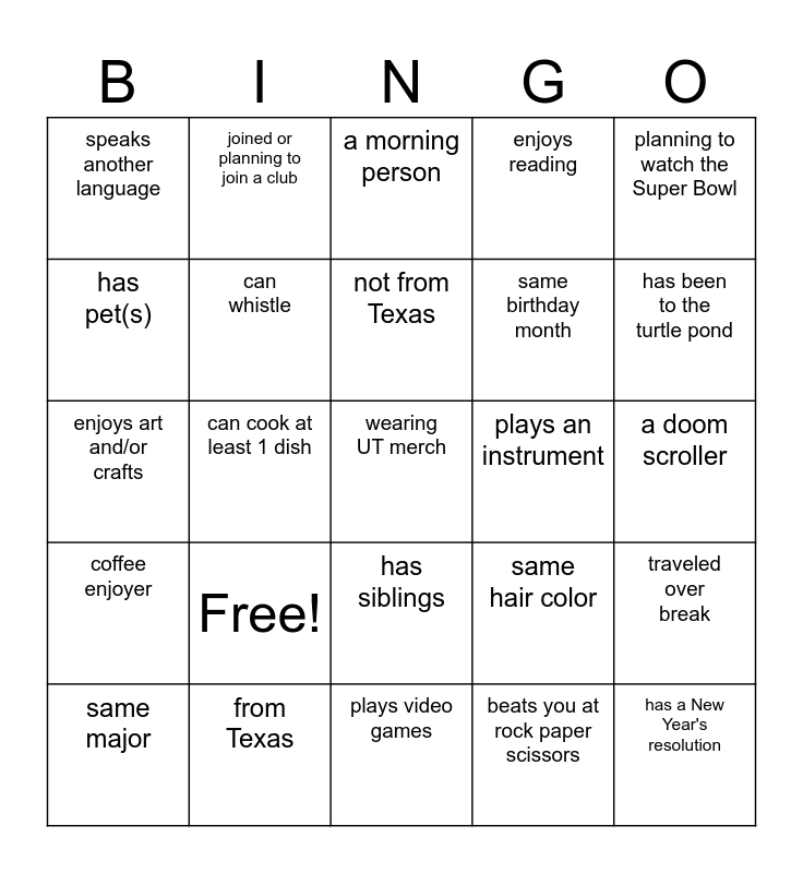 This bingo card has a free space and 24 words: Free!, from Texas, not from Texas, same major, planning to watch the Super Bowl, speaks another language, has pet(s), joined or planning to join a club, plays an instrument, has siblings, same birthday month, enjoys art and/or crafts, same hair color, traveled over break, can whistle, beats you at rock paper scissors, a doom scroller, a morning person, has been to the turtle pond, can cook at least 1 dish, has a New Year's resolution, coffee enjoyer, enjoys reading and plays video games.