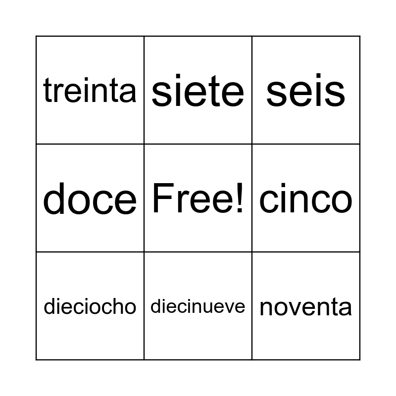 This bingo card has a free space and 28 words: uno, dos, tres, cuatro, cinco, seis, siete, ocho, nueve, diez, once, doce, trece, catorce, quince, dieciseis, diecisiete, dieciocho, diecinueve, veinte, treinta, cuarenta, cincuenta, sesenta, setenta, ochenta, noventa and cien.