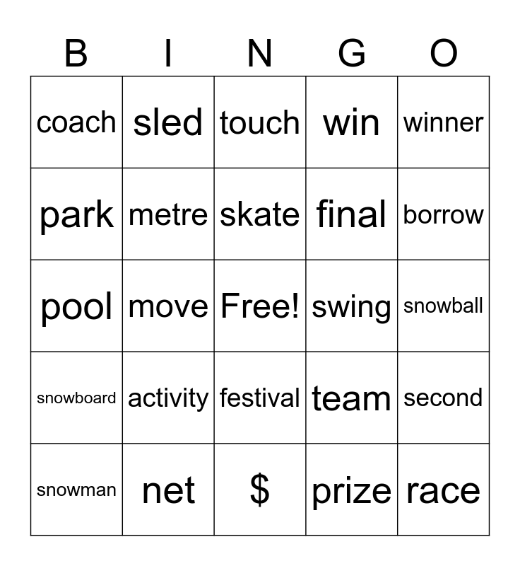 This bingo card has a free space and 24 words: activity, net, skate, snowman, winner, coach, park, sled, swing, festival, final, pool, team, second, metre, prize, snowball, touch, borrow, move, race, snowboard, win and $.