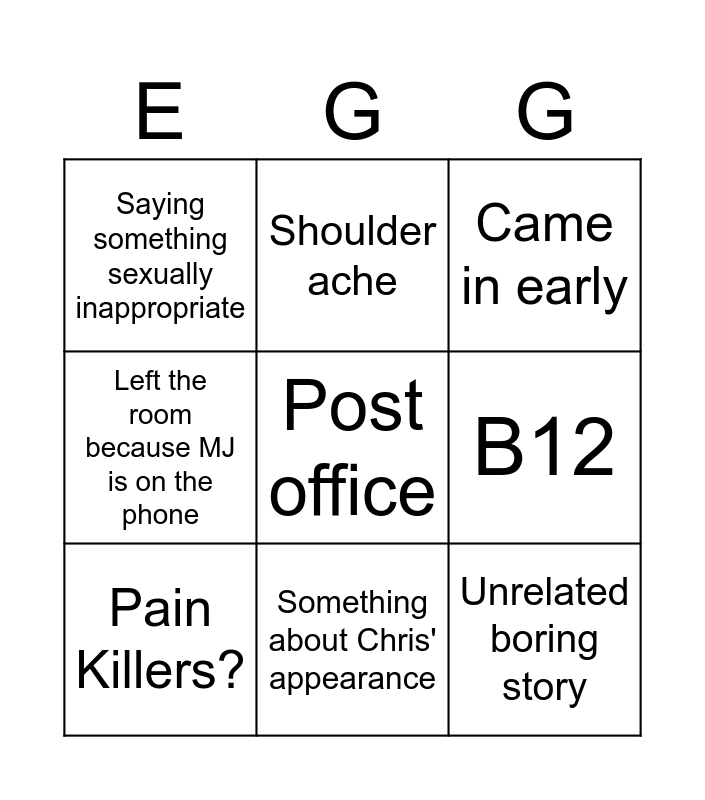 This bingo card has a free space and 8 words: B12, Came in early, Shoulder ache, Pain Killers?, Saying something sexually inappropriate, Unrelated boring story, Left the room because MJ is on the phone and Something about Chris' appearance.