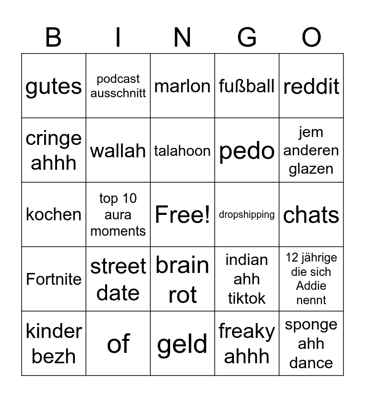 This bingo card has a free space and 24 words: street date, of, talahoon, kinder bezh, reddit, gutes, cringe ahhh, podcast ausschnitt, dropshipping, brain rot, pedo, kochen, indian ahh tiktok, 12 jährige die sich Addie nennt, wallah, freaky ahhh, chats, marlon, jem anderen glazen, top 10 aura moments, sponge ahh dance, Fortnite, fußball and geld.