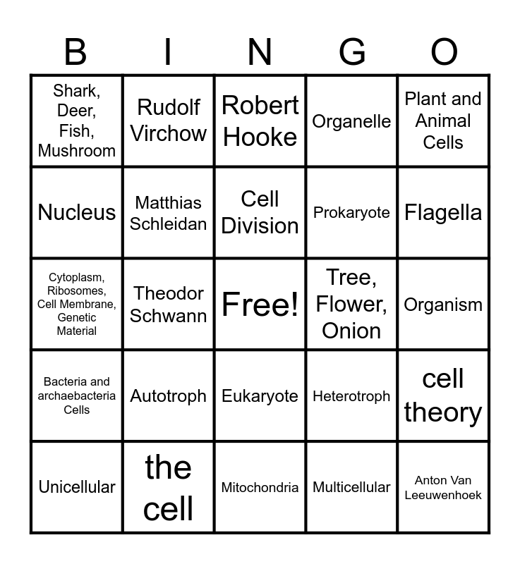 This bingo card has a free space and 24 words: Autotroph, the cell, Cell Division, Unicellular, Plant and Animal Cells, Shark, Deer, Fish, Mushroom, Nucleus, Rudolf Virchow, Tree, Flower, Onion, Eukaryote, Prokaryote, Cytoplasm, Ribosomes, Cell Membrane, Genetic Material, Heterotroph, cell theory, Matthias Schleidan, Multicellular, Organism, Robert Hooke, Flagella, Theodor Schwann, Anton Van Leeuwenhoek, Bacteria and archaebacteria Cells, Organelle and Mitochondria.