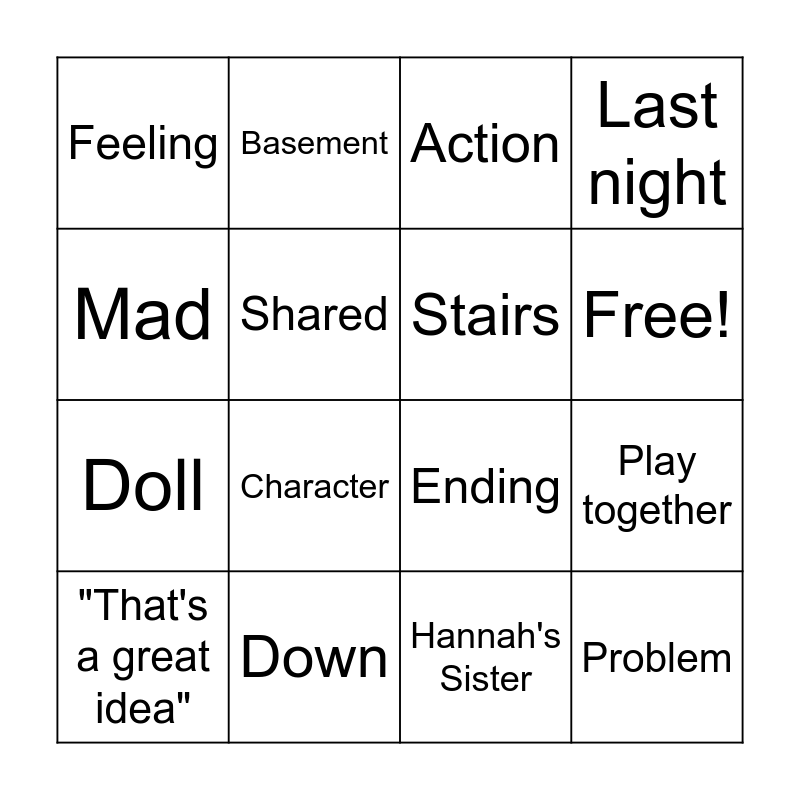 This bingo card has 18 words: Character, Problem, Action, Feeling, Ending, Last night, "That's a great idea", Basement, Free!, Doll, Hannah's Sister, Mad, Play together, Shared, Stairs, Hannah, Down and Cheerfully.