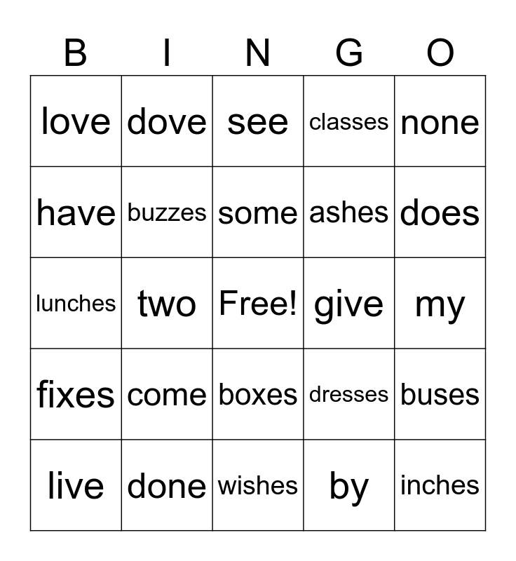 This bingo card has a free space and 24 words: come, done, some, live, none, love, have, dove, give, boxes, ashes, lunches, dresses, buses, buzzes, by, my, see, does, two, inches, fixes, classes and wishes.