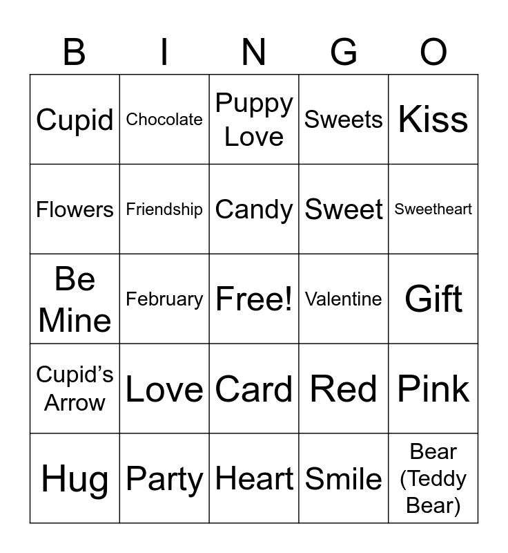 This bingo card has a free space and 25 words: Love, Heart, Candy, Hug, Kiss, Cupid, Flowers, Chocolate, Valentine, Card, Sweet, Be Mine, Red, Pink, Friendship, Roses, Gift, Puppy Love, Sweetheart, February, Bear (Teddy Bear), Party, Cupid’s Arrow, Sweets and Smile.