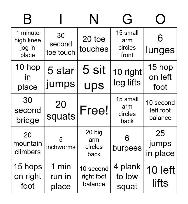 This bingo card has a free space and 24 words: 5 inchworms, 1 min run in place, 5 sit ups, 15 hops on right foot, 6 lunges, 1 minute high knee jog in place, 10 hop in place, 30 second toe touch, 15 small arm circles back, 20 big arm circles back, 10 right leg lifts, 30 second bridge, 6 burpees, 25 jumps in place, 5 star jumps, 4 plank to low squat, 10 second left foot balance, 20 toe touches, 15 hop on left foot, 20 squats, 10 left lifts, 20 mountain climbers, 15 small arm circles front and 10 second right foot balance.