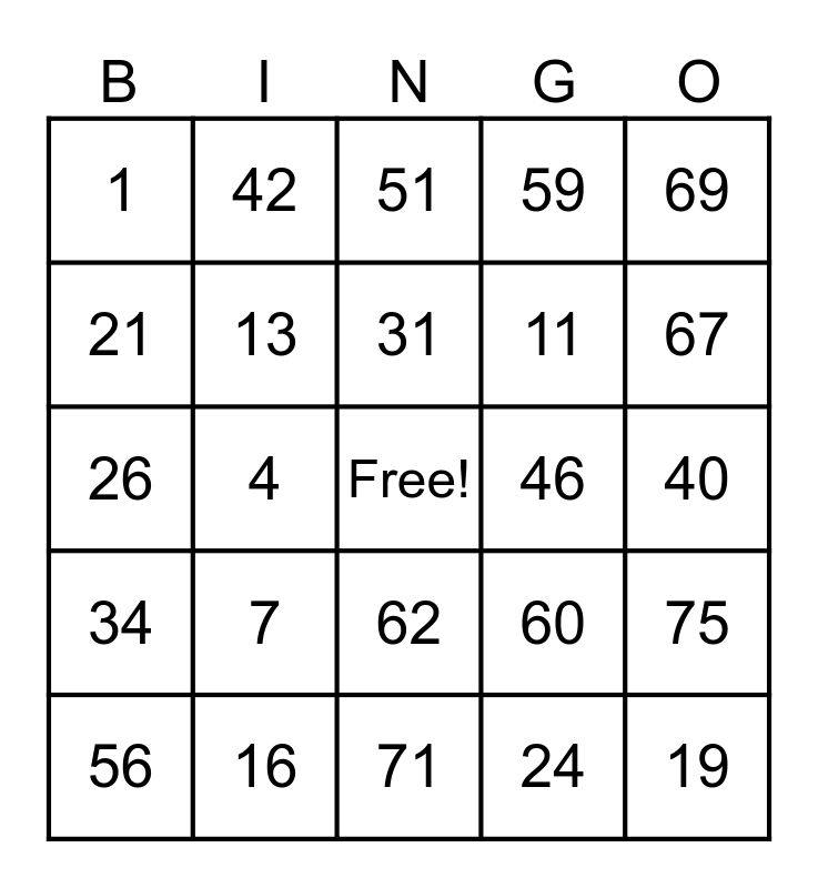 This bingo card has a free space and 24 words: 7, 16, 31, 56, 69, 1, 21, 42, 46, 62, 11, 26, 60, 75, 13, 24, 40, 51, 67, 4, 19, 34, 59 and 71.