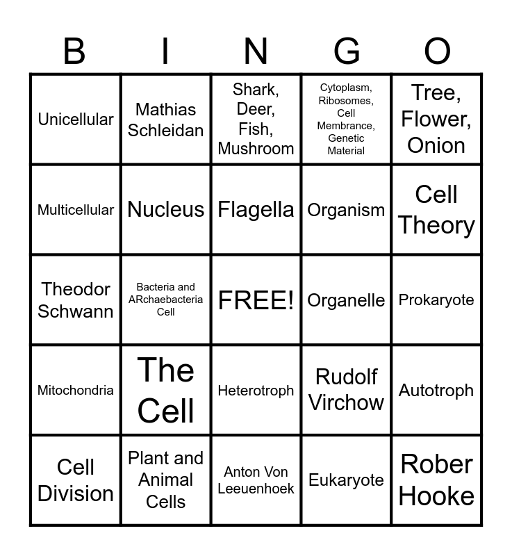 This bingo card has a free space and 24 words: The Cell, Plant and Animal Cells, Flagella, Cell Division, Tree, Flower, Onion, Unicellular, Multicellular, Mathias Schleidan, Organelle, Heterotroph, Organism, Theodor Schwann, Rudolf Virchow, Autotroph, Nucleus, Eukaryote, Prokaryote, Shark, Deer, Fish, Mushroom, Cell Theory, Bacteria and ARchaebacteria Cell, Rober Hooke, Mitochondria, Cytoplasm, Ribosomes, Cell Membrance, Genetic Material and Anton Von Leeuenhoek.
