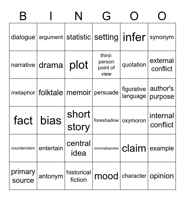 This bingo card has 48 words: personification, metaphor, simile, oxymoron, figurative language, onomatopoeia, argument, explanatory essay, synonym, antonym, narrative, setting, bias, fact, opinion, central idea, drama, folktale, protagonist, infer, external conflict, internal conflict, dialogue, plot, first-person point of view, third-person point of view, short story, theme, author's purpose, persuade, inform, entertain, character, flashback, foreshadow, historical fiction, mood, memoir, primary source, secondary source, claim, counterclaim, statistic, anecdote, quotation, cite, example and novel.