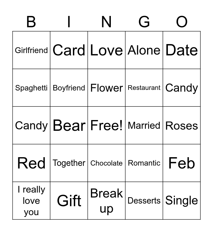 This bingo card has a free space and 40 words: Heart, Candy, Pink, Boyfriend, Gift, Chocolate, Flower, Love letter, Date, Red, Bear, Alone, Single, Roses, Married, Together, Kiss, Girlfriend, Just friends, Love, Feb, Desserts, Restaurant, Spaghetti, Music, Cupid, Anniversary, Celebration, Party, Fall in love, I love you, I really love you, Movie, Romantic, Candy, Break up, Flirt, Handsome, Card and Pass out.