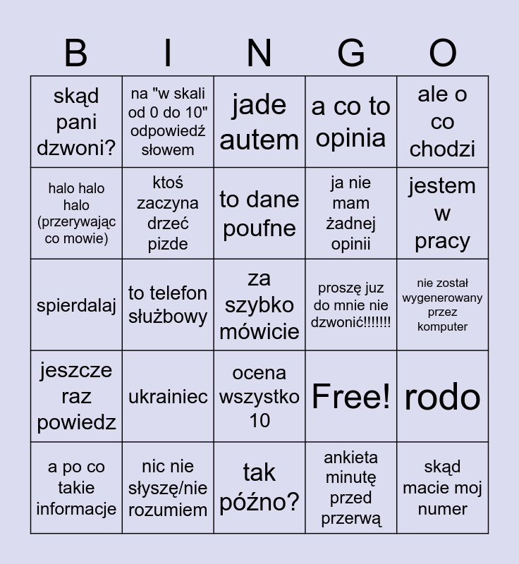 This bingo card has 25 words: ukrainiec, tak późno?, to dane poufne, a po co takie informacje, ale o co chodzi, skąd pani dzwoni?, halo halo halo (przerywając co mowie), na "w skali od 0 do 10" odpowiedź słowem, proszę juz do mnie nie dzwonić!!!!!!!, ocena wszystko 10, ja nie mam żadnej opinii, spierdalaj, Free!, rodo, ktoś zaczyna drzeć pizde, skąd macie moj numer, nie został wygenerowany przez komputer, jade autem, jestem w pracy, to telefon służbowy, za szybko mówicie, nic nie słyszę/nie rozumiem, jeszcze raz powiedz, a co to opinia and ankieta minutę przed przerwą.