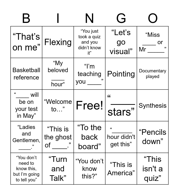 This bingo card has a free space and 31 words: “You don’t know this?”, “Surely you know this.”, “Welcome to…”, “Can’t you see what this leads to?”, “That’s on me”, “You just took a quiz and you didn’t know it”, “My beloved ____ hour“, “______ hour didn't get this”, “____ stars”, “This is America”, Synthesis, “This isn't a quiz”, “Not enough hands, let’s try again”, “Venezuela”, Documentary played, “Take a look at this”, “Pencils down”, “This is the ghost of ____.”, “Ladies and Gentlemen, ____.”, “To the back board”, “Miss ____ or Mr _____”, “You’re not ready for this yet”, “You don’t need to know this, but I’m going to tell you”, Flexing, Pointing, Basketball reference, “Let’s go visual”, “____ will be on your test in May”, “Turn and Talk”, “I’m teaching you ____” and “History repeats itself/full circle”.