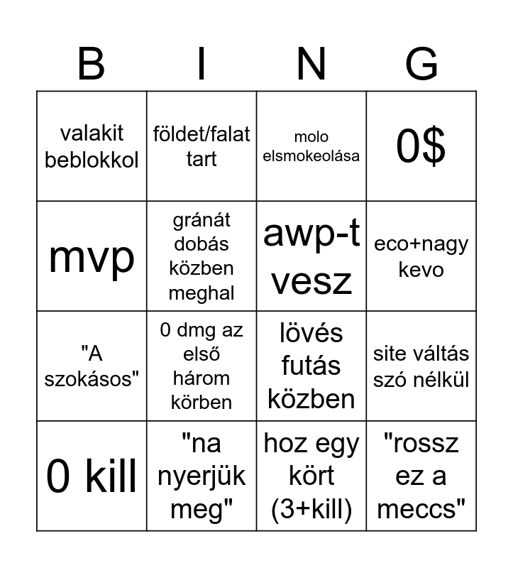 This bingo card has 16 words: "na nyerjük meg", site váltás szó nélkül, molo elsmokeolása, valakit beblokkol, "A szokásos", földet/falat tart, lövés futás közben, hoz egy kört (3+kill), mvp, gránát dobás közben meghal, 0 kill, 0$, 0 dmg az első három körben, eco+nagy kevo, awp-t vesz and "rossz ez a meccs".