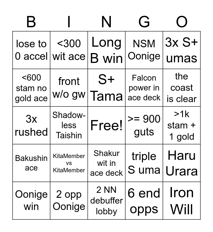 This bingo card has a free space and 24 words: KitaMember vs KitaMember, 2 opp Oonige, S+ Tama, Oonige win, 3x S+ umas, lose to 0 accel, <600 stam no gold ace, <300 wit ace, >= 900 guts, Shakur wit in ace deck, Falcon power in ace deck, 3x rushed, triple S uma, Haru Urara, front w/o gw, 6 end opps, >1k stam + 1 gold, Long B win, the coast is clear, Shadow-less Taishin, Iron Will, Bakushin ace, NSM Oonige and 2 NN debuffer lobby.