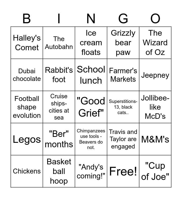 This bingo card has 30 words: Basket ball hoop, Ice cream trucks, Cruise ships-cities at sea, Bubblegum Alley, Halley's Comet, Ice cream floats, Rabbit's foot, Chimpanzees use tools - Beavers do not., Superstitions-13, black cats.., "Andy's coming!", Jollibee-like McD's, "Good Grief", Free!, "Cup of Joe", Jeepney, Monopoly-everyone cheats, Travis and Taylor are engaged, Legos, "Ber" months, The Wizard of Oz, Football shape evolution, Scents and your mood, The Autobahn, Farmer's Markets, Dubai chocolate, Grizzly bear paw, M&M's, Chickens, School lunch and Cybertruck.