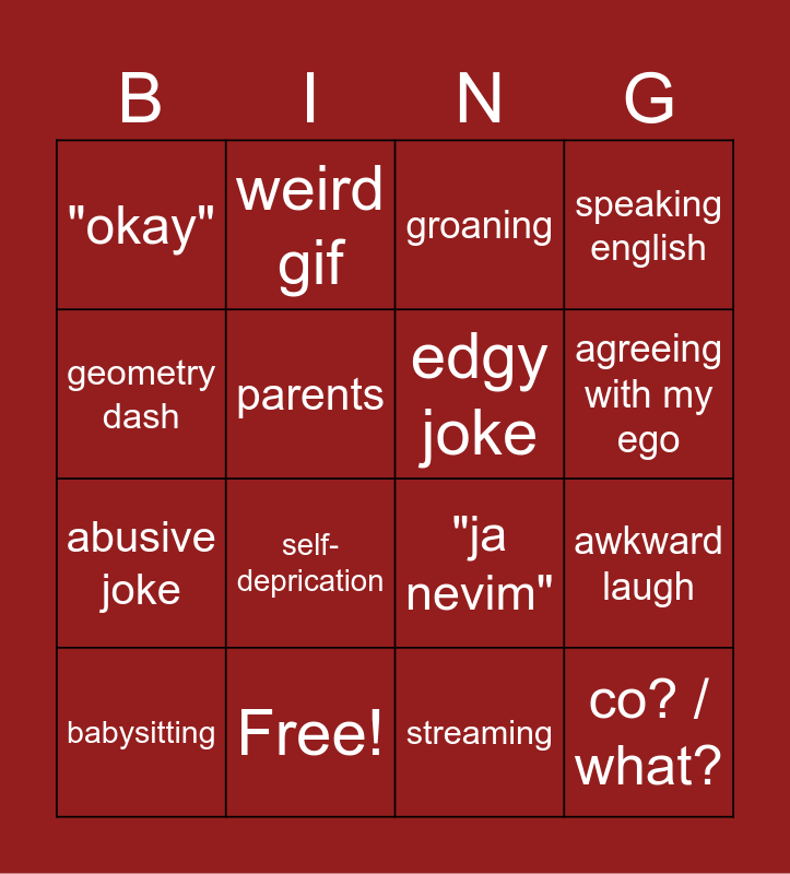 This bingo card has 16 words: Free!, awkward laugh, groaning, "okay", abusive joke, weird gif, "ja nevim", streaming, geometry dash, parents, babysitting, speaking english, self-deprication, agreeing with my ego, edgy joke and co? / what?.