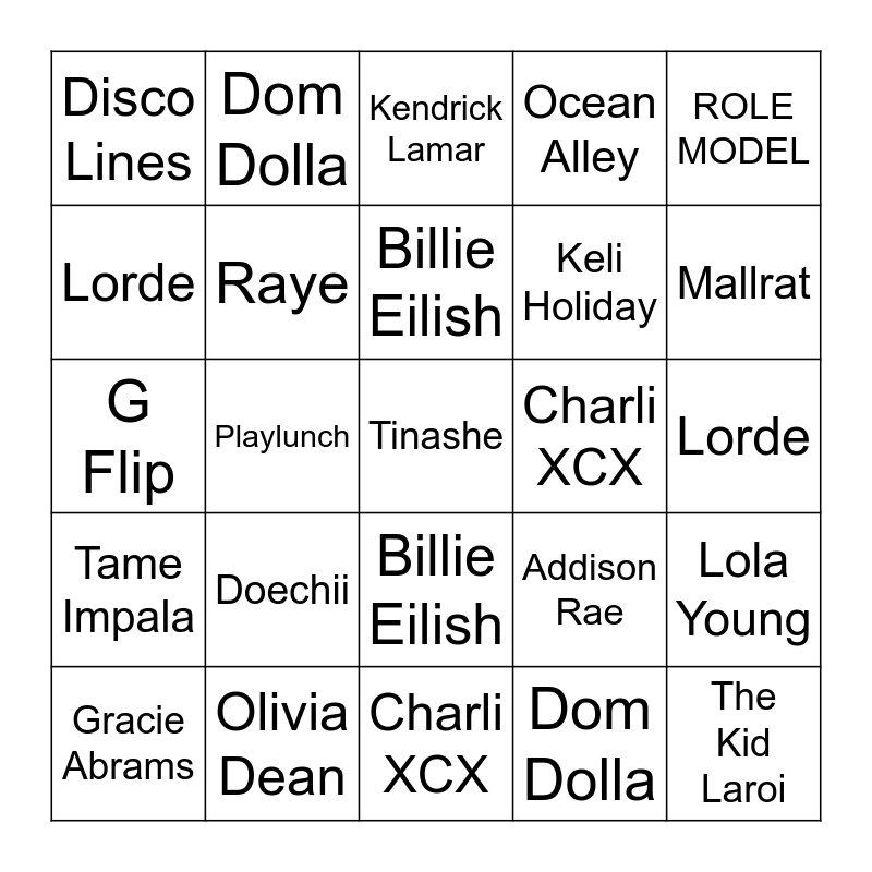 ⚠ This card has duplicate items: Olivia Dean (2), Spacey Jane (2), Tame Impala (2), Dom Dolla (2), Fred again.. (2), Raye (2), Playlunch (2), Keli Holiday (2), G Flip (2), Ocean Alley (2), Doechii (2), Lorde (2), Ninajirachi (2), Addison Rae (2), Disco Lines (2), Tinashe (2), ROLE MODEL (2), Royel Otis (2), Billie Eilish (2), Charli XCX (2), Kendrick Lamar (2), Gracie Abrams (2), Lola Young (2), Sombr (2), Chappell Rone (2), Lime Cordiale (2), Hayley Williams (2), Mallrat (2), The Kid Laroi (2), Tate McRae (2)